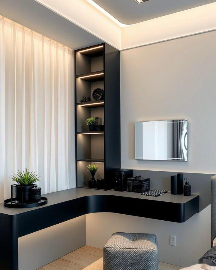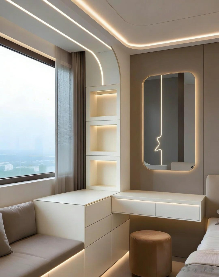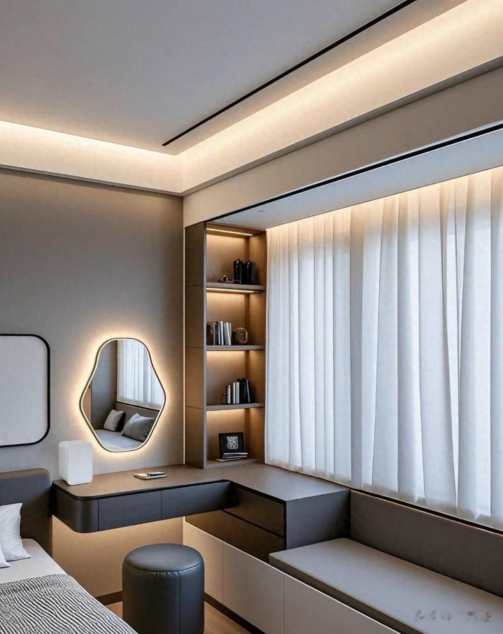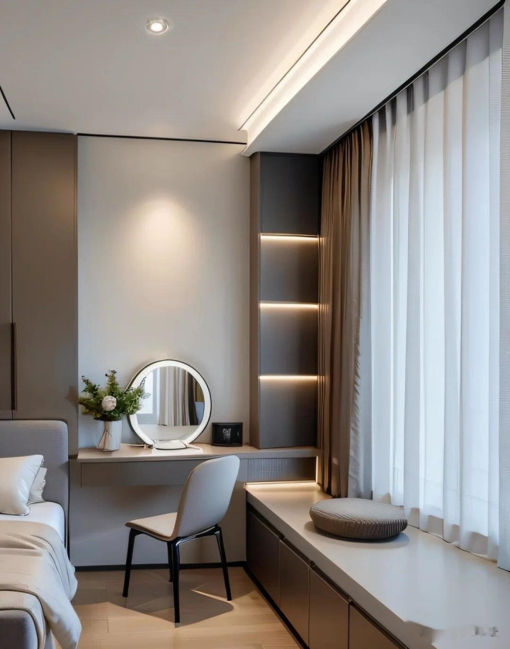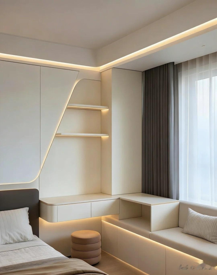 L形书桌连体盘算,空间愚弄极致,暖光灯带营造温馨氛围,窗台小洞开格收纳小物品,既好意思不雅又实用。