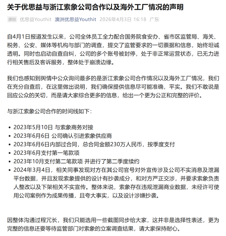 每经AI快讯,4月3日,优念念益通过其微信公众号发布对于优念念益与浙江索象公司结合以及国外工场情况的声明。声明称,自4月1日报谈发生以来,公司全体职工全力配合国务院食安办、省市区监管局、海关、税务、公安、媒体等机构与部门的探询,提交了监管条件的一切单据和信息,抢庄牛牛app下载长期坦诚透明。同期也开动自查自纠,公司的多个账号被封停,处于非昔时运营景色,已无力进行关系售后及客诉办事,全体处于崩溃旯旮。