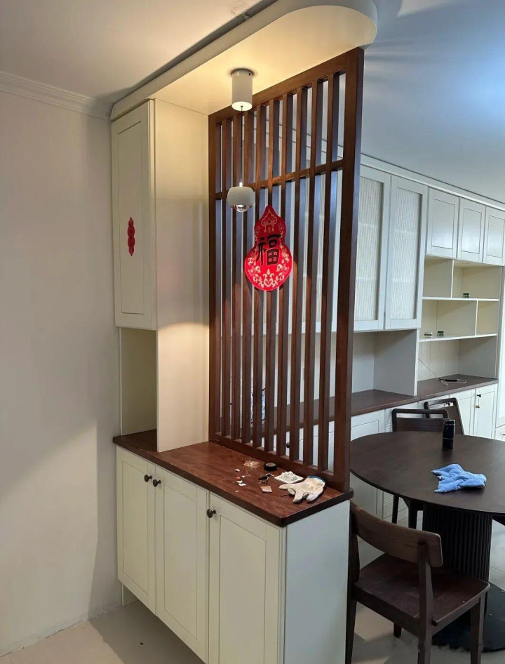网友@老周 家(100㎡三居室):进门正对餐厅,不念念挡采光,就定制了一组半通透玄关柜,下半部分阻滞放鞋子,上半部分作念镂空格栅,既能挡住餐厅视野,又不影响光辉畅通,柜子侧面还作念了转角蓄意,蔓延出一个小吧台,正常不错放些小摆件,颜值径直拉满。