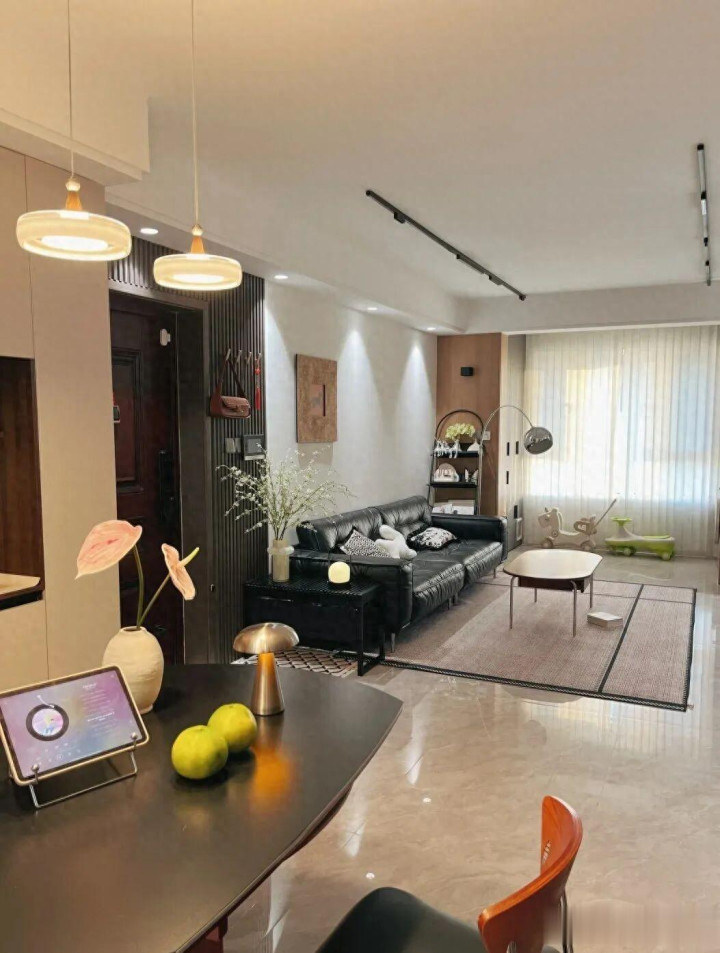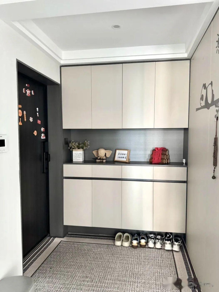 网友@小宇 家(95㎡三居室):进门正对客厅,两侧都莫得过剩墙面,就精巧借了餐厅的边角空间,在进门左侧、餐厅餐桌旁,放了一个窄款餐边柜,兼具玄关鞋柜一体蓄意功能,用来放鞋子、包包;侧面鞋柜换穿拖鞋超便捷 ,既能换鞋、收纳,又能行为玄关和客厅餐桌的缓冲,隐形又实用,小数都不突兀。