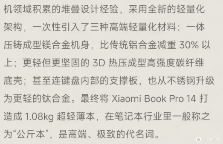 那么接下来不错分析一下这段话,第一段是全新轻量化结构,打造了1.08kg的超漂浮本,也等于1008g,还没到三位数,超轻量得往后稍微。
