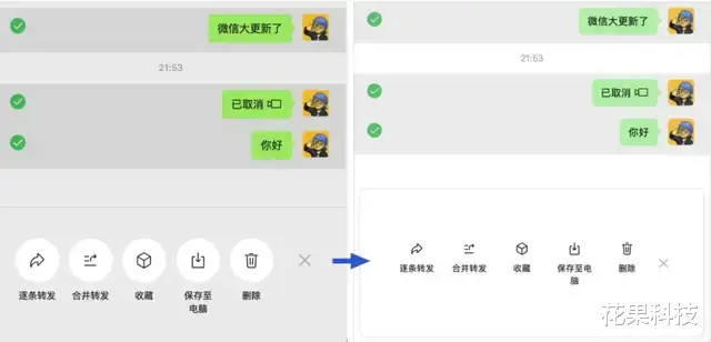 在对话界面多选聊天后的底部操作按钮也有了新的口头,诚然全体布局如故莫得变化的。