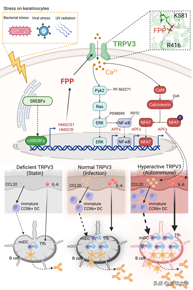 粗浅来说,当皮肤被病菌感染或被强紫外线照耀时,皮肤的角质酿成细胞会初始救急反馈,让细胞内快速积聚FPP。这种物资是细胞发出的“免疫警报素”,抢庄牛牛app下载它会精确承接细胞上的TRPV3胞内结构域,就像钥匙掀开锁通常,让钙离子插足细胞内,进而激活两条信号通路,促使细胞分泌出IL-6和CCL20两种关节物资。