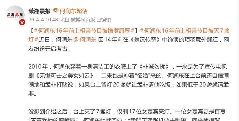 时刻倒回2010年,其时已是有名演员的何润东,真实穿戴独处清洁工的衣服,登上了其时火爆世界的相亲节目《非诚勿扰》。他这趟来,一是为了宣传我方主演的电视剧《无孔不钻之八百姻娇》,二来也带着点“弄假成真”征婚的心想。上台前,何润东还自信满满地和主执东说念主孟非打赌:如果台上能为他留灯20盏,孟非就得请他吃饭;淌若低于20盏,就他请孟非。