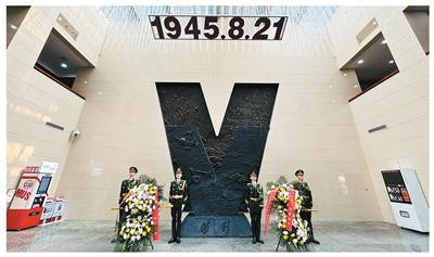 图为与会东谈主员向中国东谈主民抗战得手受降缅念念馆内的得手V字雕镂献花。