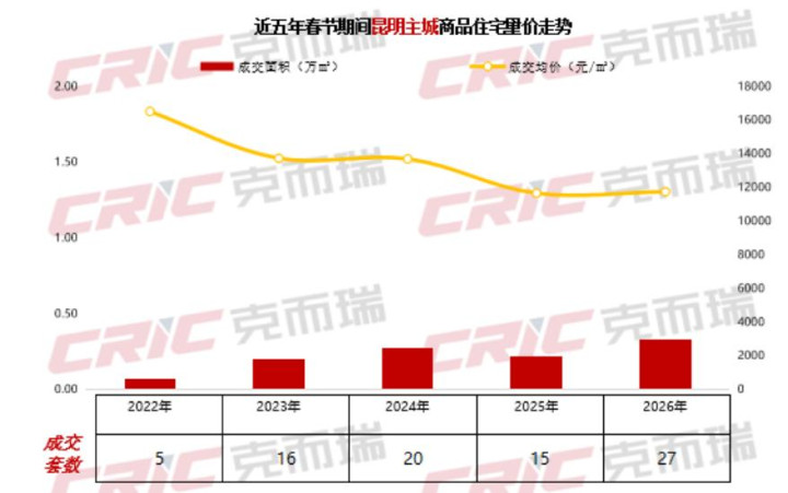 尽头发挥的是,春节假期昆明的住宅备案共计27套,约0.33万㎡,同比飞腾54%;成交均价约11651元/㎡,同比微涨1%。同期,亦然近5年来,成交最佳的一年。