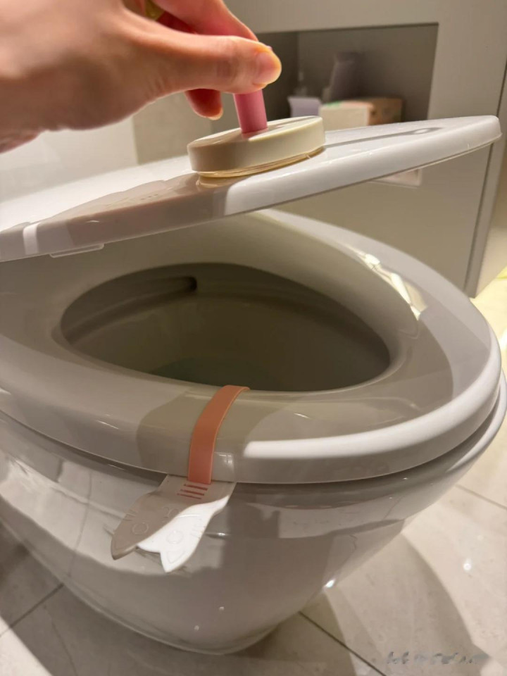 只需要将提手用热熔胶固定在马桶盖上,念念提马桶盖的时候径直拉提手,马桶盖就缓慢翻开了。
