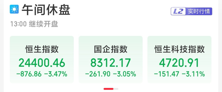中新经纬3月23日电周一早盘,港股三大指数集体下落。为止午间收盘,恒生指数跌3.47%,恒生科技指数跌3.11%,恒生国企指数跌3.05%。大市半日成交额1924亿港元。